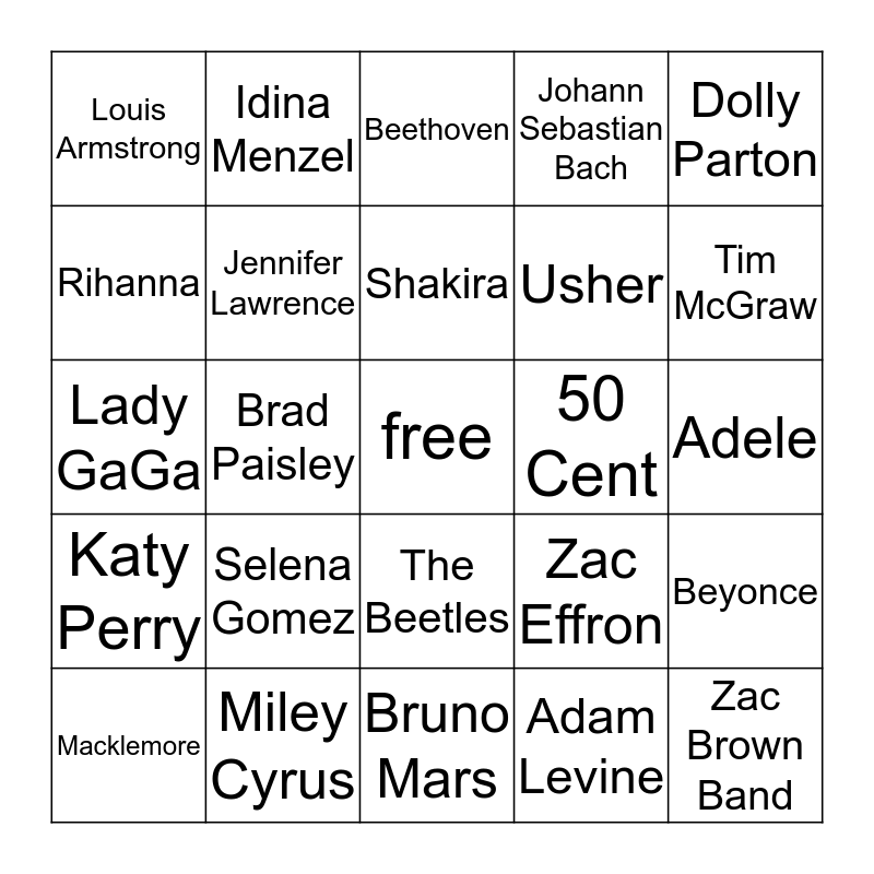 This bingo card has a free space and 24 words: Selena Gomez, Miley Cyrus, Shakira, Macklemore, Dolly Parton, Louis Armstrong, Rihanna, Idina Menzel, 50 Cent, The Beetles, Usher, Lady GaGa, Zac Effron, Beyonce, Jennifer Lawrence, Adam Levine, Adele, Beethoven, Tim McGraw, Brad Paisley, Zac Brown Band, Katy Perry, Johann Sebastian Bach and Bruno Mars.