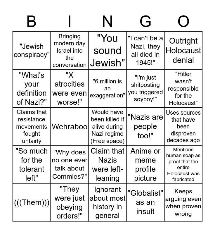 This bingo card has a free space and 24 words: "Why does no one ever talk about Commies?", "They were just obeying orders!", "6 million is an exaggeration", (((Them))), Outright Holocaust denial, "Jewish conspiracy", "What's your definition of Nazi?", Bringing modern day Israel into the conversation, "Nazis are people too!", Claim that Nazis were left-leaning, "I'm just shitposting you triggered soyboy!", Claims that resistance movements fought unfairly, Anime or meme profile picture, Mentions human soap as proof that the entire Holocaust was fabricated, "X atrocities were even worse!", "Globalist" as an insult, Uses sources that have been disproven decades ago, "You sound Jewish", "Hitler wasn't responsible for the Holocaust", Wehraboo, Keeps arguing even when proven wrong, "So much for the tolerant left", "I can't be a Nazi, they all died in 1945!" and Ignorant about most history in general.