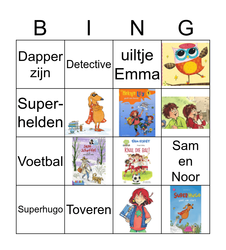 This bingo card has 10 images and 10 words: Sam en Noor, Sam Schoffel, uiltje Emma, Heksje Lilly, Superhugo, Super-helden, Toveren, Dapper zijn, Voetbal and Detective.
