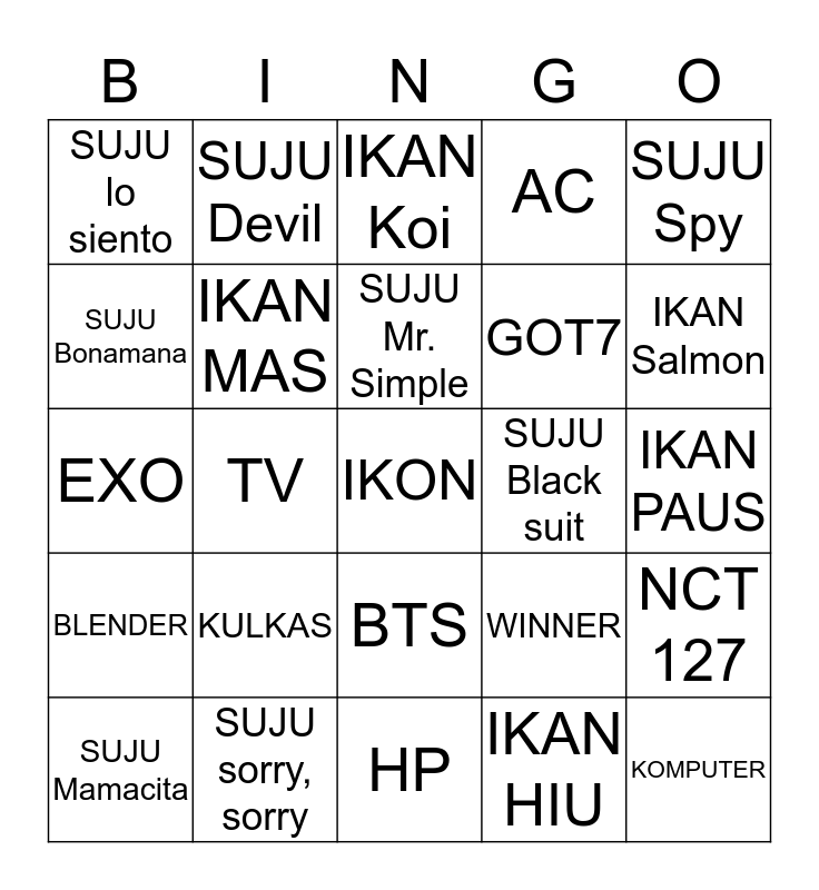 This bingo card has a free space and 24 words: KULKAS, SUJU sorry, sorry, SUJU Mr. Simple, SUJU Mamacita, SUJU Spy, SUJU lo siento, SUJU Bonamana, SUJU Devil, SUJU Black suit, BTS, GOT7, EXO, WINNER, NCT 127, IKAN MAS, IKAN HIU, IKAN PAUS, IKAN Koi, IKAN Salmon, TV, KOMPUTER, BLENDER, AC and HP.