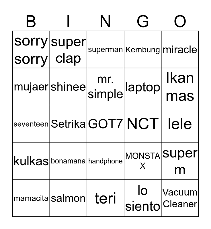 This bingo card has a free space and 24 words: mamacita, bonamana, mr. simple, lo siento, miracle, sorry sorry, super clap, superman, NCT, lele, seventeen, shinee, MONSTA X, super m, mujaer, salmon, teri, Kembung, Ikan mas, kulkas, Setrika, handphone, laptop and Vacuum Cleaner.