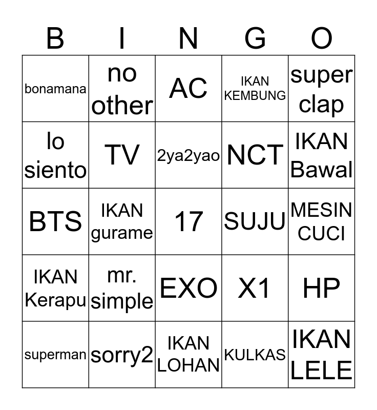 This bingo card has a free space and 24 words: mr. simple, sorry2, 2ya2yao, superman, super clap, bonamana, lo siento, no other, SUJU, EXO, NCT, BTS, X1, HP, TV, KULKAS, MESIN CUCI, AC, IKAN Bawal, IKAN gurame, IKAN LELE, IKAN Kerapu, IKAN KEMBUNG and IKAN LOHAN.