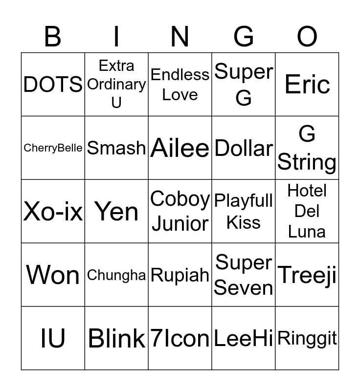 This bingo card has a free space and 24 words: IU, Chungha, Ailee, LeeHi, Eric, DOTS, Extra Ordinary U, Endless Love, Playfull Kiss, Hotel Del Luna, Xo-ix, Smash, Super Seven, Treeji, CherryBelle, Blink, 7Icon, Super G, G String, Won, Yen, Rupiah, Dollar and Ringgit.