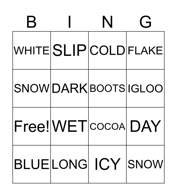 This bingo card has 20 words: DAY, DANCE, COLD, FROST, BLUE, SNOW, LONG, WHITE, Free!, SLIP, WET, COCOA, DARK, SNOW, BOOTS, GLOVES, IGLOO, FLAKE, ICY and LIGHT.