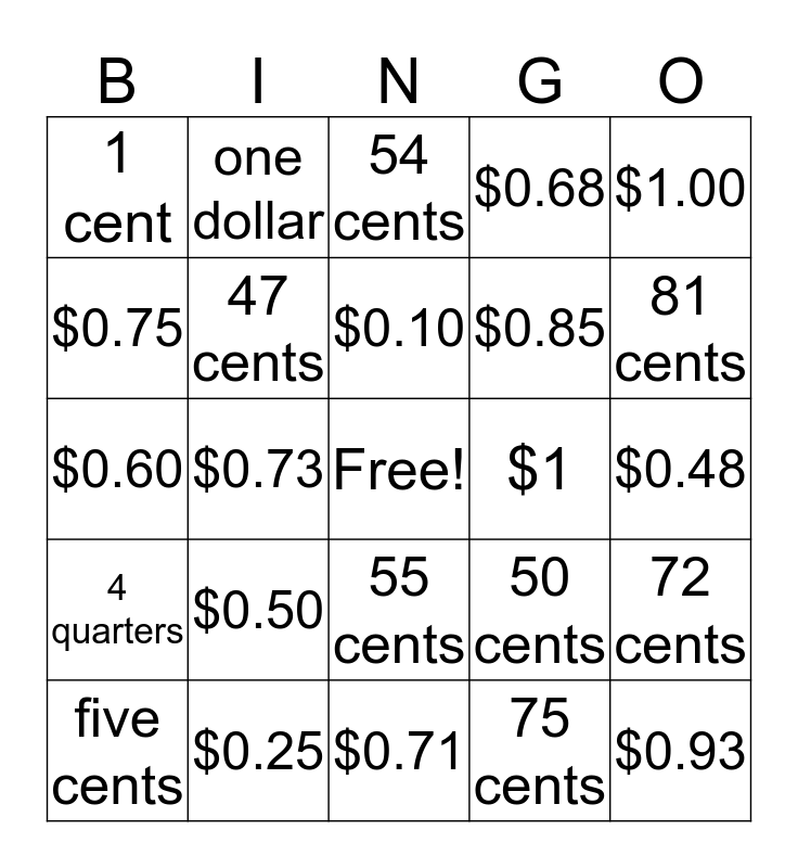 This bingo card has a free space and 24 words: $0.50, $0.25, $0.10, five cents, $1.00, 1 cent, $0.75, one dollar, $1, 55 cents, $0.85, $0.60, 50 cents, 72 cents, 47 cents, 75 cents, $0.48, 54 cents, 81 cents, $0.73, $0.93, 4 quarters, $0.68 and $0.71.