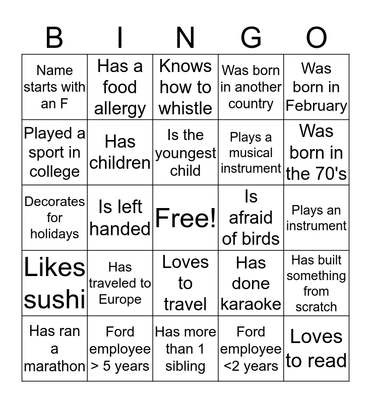 This bingo card has a free space and 39 words: Is wearing Yellow, Had braces, Can speak another language, Has children, Has ran a marathon, Loves to travel, Is the youngest child, Does yoga, Was born in February, Likes sushi, Is left handed, Was born in another country, Loves to read, Plays an instrument, Is afraid of birds, Has traveled to Europe, Loves spicy foods, Name starts with an F, Has more than 1 pet, Has done karaoke, Played a sport in college, Has more than 1 sibling, Plays a musical instrument, Was born in the 70's, Wears eyeglasses, Has rode a motorcycle, Shops with coupons, Uses a planner, Likes to garden, Has a food allergy, Does not drink coffee, Is younger than you, Knows how to whistle, Ford employee > 5 years, Ford employee <2 years, Been on a blind date, Has built something from scratch, Decorates for holidays and Likes to go camping.