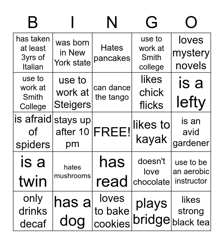 This bingo card has a free space and 24 words: hates mushrooms, has a dog, can dance the tango, only drinks decaf, loves mystery novels, has taken at least 3yrs of Italian, use to work at Smith College, was born in New York state, likes to kayak, has read, likes chick flicks, is afraid of spiders, doesn't love chocolate, use to be an aerobic instructor, use to work at Steigers, plays bridge, is an avid gardener, Hates pancakes, is a lefty, stays up after 10 pm, likes strong black tea, is a twin, use to work at Smith college and loves to bake cookies.