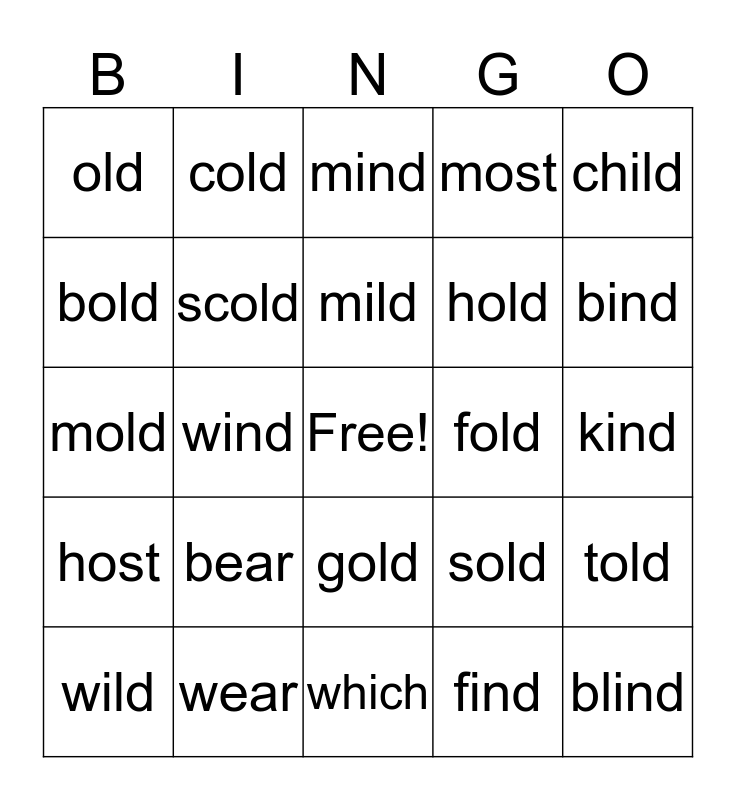 This bingo card has a free space and 24 words: bear, wear, mild, wild, child, old, bold, cold, fold, gold, hold, mold, sold, told, scold, find, kind, mind, bind, wind, blind, host, most and which.
