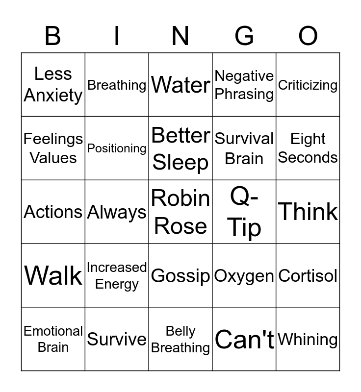 This bingo card has a free space and 27 words: Oxygen, Thinking Brain, Survival Brain, Belly Breathing, Feelings Values, Water, Breathing, Walk, Q-Tip, Cortisol, Actions, Negative Phrasing, Emotional Brain, Survive, Eight Seconds, Relating, Positioning, Better Sleep, Increased Energy, Less Anxiety, Think, Can't, Always, Whining, Gossip, Criticizing and Commode.