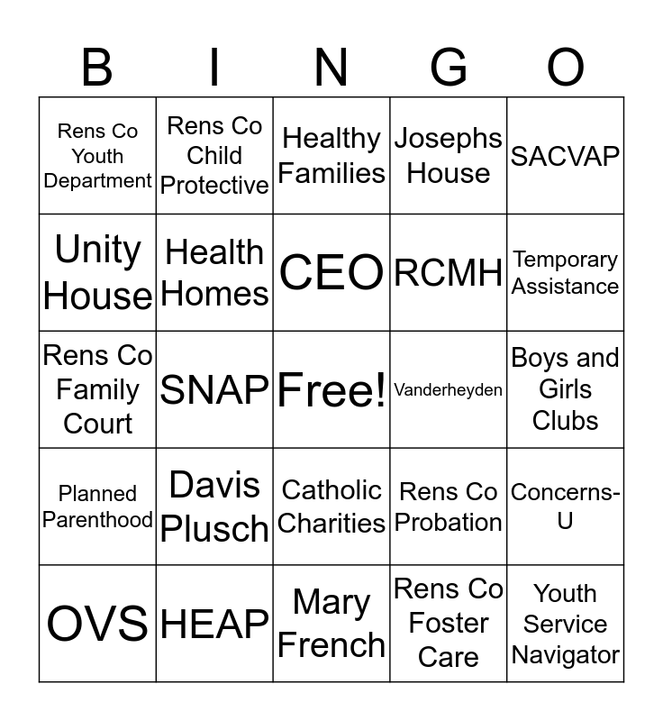 This bingo card has a free space and 24 words: Davis Plusch, HEAP, CEO, OVS, SACVAP, Rens Co Youth Department, Unity House, Rens Co Child Protective, Vanderheyden, Catholic Charities, RCMH, Rens Co Family Court, Rens Co Probation, Concerns-U, Health Homes, Rens Co Foster Care, Boys and Girls Clubs, Healthy Families, Temporary Assistance, SNAP, Youth Service Navigator, Planned Parenthood, Josephs House and Mary French.