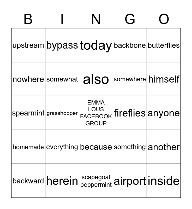 This bingo card has a free space and 24 words: everything, herein, also, backward, butterflies, upstream, nowhere, bypass, fireflies, because, somewhere, spearmint, something, another, somewhat, airport, anyone, today, himself, grasshopper, inside, homemade, backbone and scapegoat peppermint.
