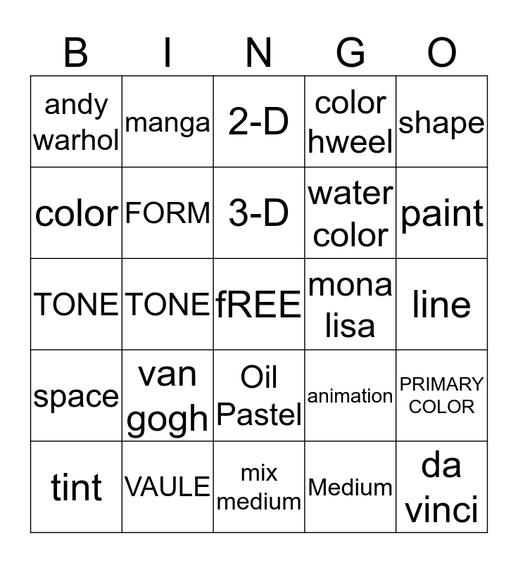 This bingo card has a free space and 24 words: van gogh, VAULE, 3-D, tint, shape, andy warhol, color, manga, mona lisa, Oil Pastel, water color, TONE, animation, PRIMARY COLOR, FORM, Medium, line, 2-D, paint, TONE, da vinci, space, color hweel and mix medium.