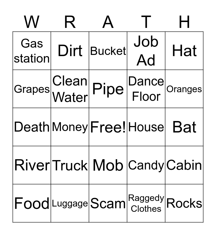This bingo card has a free space and 24 words: Truck, Luggage, Pipe, Food, Hat, Gas station, Grapes, Dirt, House, Mob, Dance Floor, Death, Candy, Cabin, Clean Water, Raggedy Clothes, Bat, Bucket, Oranges, Money, Rocks, River, Job Ad and Scam.