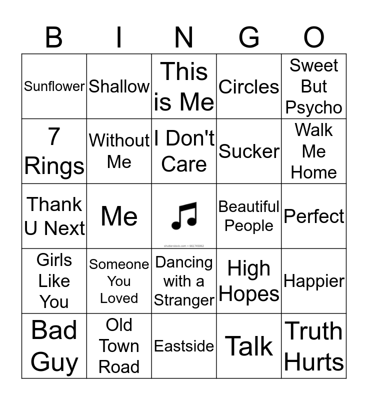 This bingo card has a free space and 24 words: Someone You Loved, Old Town Road, I Don't Care, Bad Guy, Sweet But Psycho, Sunflower, 7 Rings, Shallow, Beautiful People, Dancing with a Stranger, Sucker, Thank U Next, High Hopes, Happier, Without Me, Talk, Perfect, This is Me, Walk Me Home, Me, Truth Hurts, Girls Like You, Circles and Eastside.