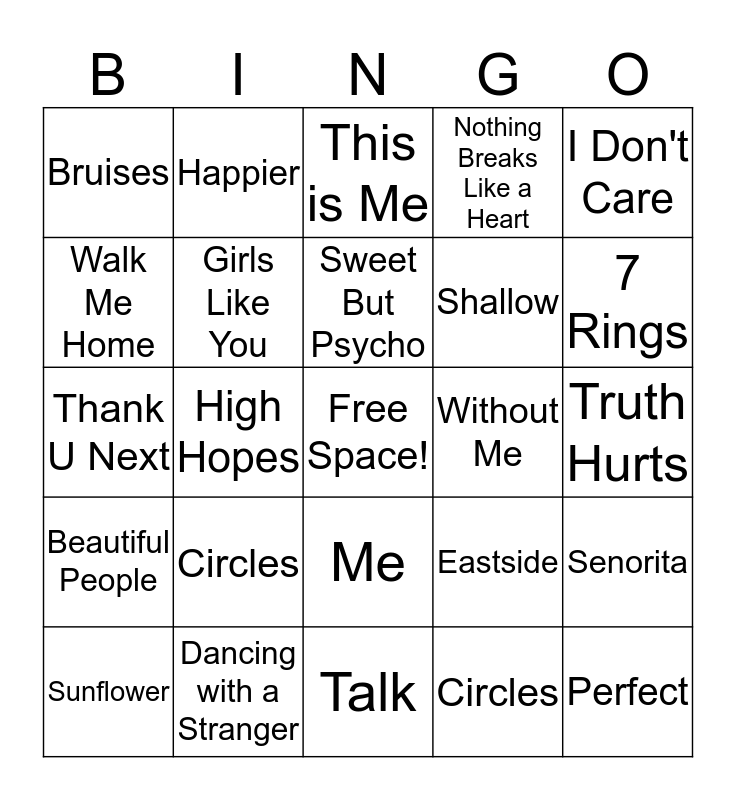 This bingo card has a free space and 24 words: Circles, Dancing with a Stranger, Sweet But Psycho, Sunflower, I Don't Care, Bruises, Walk Me Home, Happier, Without Me, Me, Shallow, Thank U Next, Eastside, Senorita, Girls Like You, Circles, Truth Hurts, This is Me, 7 Rings, High Hopes, Perfect, Beautiful People, Nothing Breaks Like a Heart and Talk.