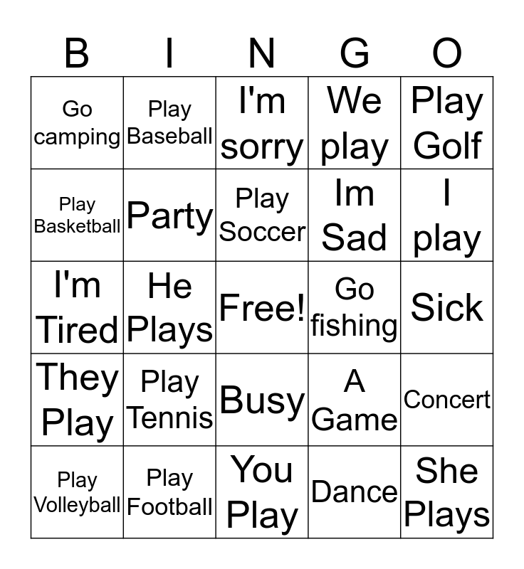 This bingo card has a free space and 24 words: Play Tennis, Play Football, Play Soccer, Play Volleyball, Play Golf, Go camping, Play Basketball, Play Baseball, Go fishing, Busy, Im Sad, I'm Tired, A Game, Concert, Party, Dance, Sick, I'm sorry, I play, He Plays, She Plays, They Play, We play and You Play.