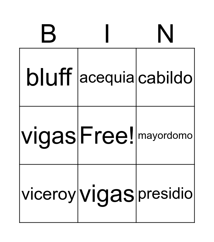 This bingo card has a free space and 11 words: refugee, vigas, presidio, viceroy, acequia, cabildo, mayordomo, regidores, vigas, bluff and banished.