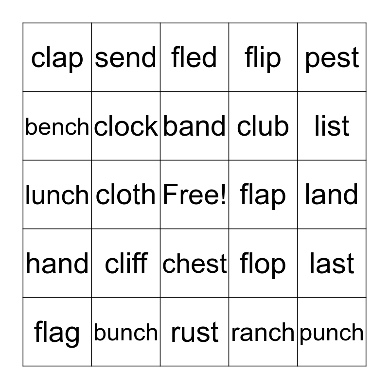 This bingo card has a free space and 24 words: cliff, bunch, band, flag, pest, clap, bench, send, flap, chest, club, lunch, flop, last, clock, ranch, land, fled, list, cloth, punch, hand, flip and rust.