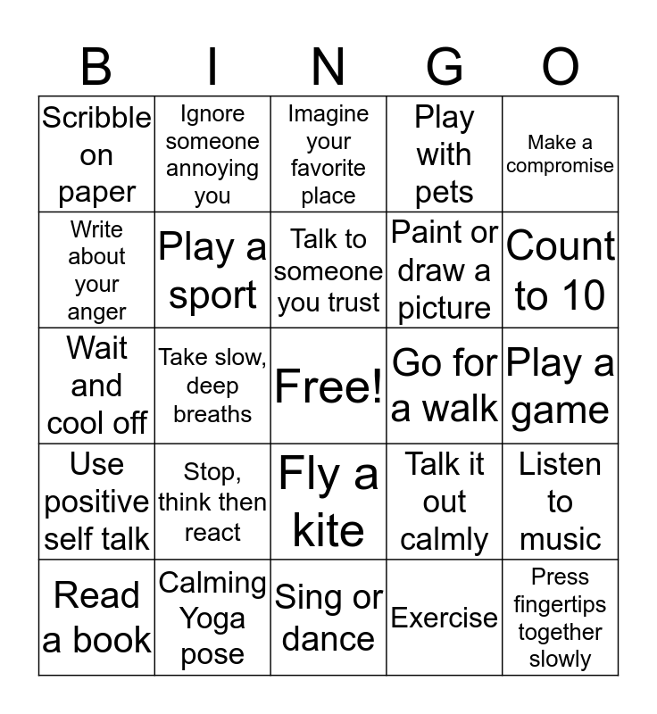 This bingo card has a free space and 24 words: Stop, think then react, Calming Yoga pose, Talk to someone you trust, Read a book, Make a compromise, Scribble on paper, Write about your anger, Ignore someone annoying you, Go for a walk, Fly a kite, Paint or draw a picture, Wait and cool off, Talk it out calmly, Listen to music, Play a sport, Exercise, Play a game, Imagine your favorite place, Count to 10, Take slow, deep breaths, Press fingertips together slowly, Use positive self talk, Play with pets and Sing or dance.