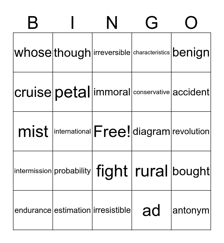 This bingo card has a free space and 229 words: admire, cyclone, fight, love, rhythm, thigh, move, hydrogen, hydrant, though, cyst, crystal, ought, admirable, myth, dough, lovable, cycle, fright, moveable, lymph, light, thought, sign, bought, resign, system, although, benign, campaign, desert, who’s, groan, coarse, align, grown, course, foreign, chord, guest, design, cord, guessed, patients, passed, mist, patience, past, missed, ad, pedal, accept, add, petal, except, air, dessert, whose, heir, isle, cruise, buoy, bored, chili, impossible, board, chilly, improbable, based, soar, immature, bass, sore, imprison, site, flour, impractical, sight, flower, impatient, feet, seem, immoral, feat, seam, imprint, crews, boy, improper, impersonal, irresponsible, cent, immortal, irrational, accept, advertise, irreversible, accent, addressed, irresistible, access, adapt, illogical, accident, admire, illegible, enclose, adjust, illiterate, encounter, advance, centigrade, encourage, admit, century, envelop, irregular, centimeter, proceed, produce, circus, compute, progress, incision, diagram, project, include, divisible, interrupt, inhale, equation, intermission, infect, equivalent, interpret, transatlantic, evaluate, international, transcend, estimation, circulate, transfer, evaluate, circumference, translate, formula, circumstance, calculate, kilometer, mean, astronomy, Europe, median, atlas, government, mode, Australia, historical, polygon, civilization, independence, probability, compromise, industrial, quotient, conservative, interdependence, range, economics, legislative, volume, empire, minority, agriculture, environment, neighborhood, Antarctica, erosion, patriotism, peninsula, vineyard, photosynthesis, political, bacteria, pollution, range, decomposes, protists, relationship, eclipse, solution, republic, environment, temperature, revolution, evaporation, aerobic, rural, fungi, athlete, San Joaquin, hypothesis, characteristics, taxation, mixtures, competitive, veteran, organism, cooperation, depressant, classification, endurance, contraction, immunizations, dictation, infectious, elaborate, relaxation, homophone, stimulant, punctuation, alphabetical, syllables, antonym, synonym, apostrophe, although, capitalization and among.