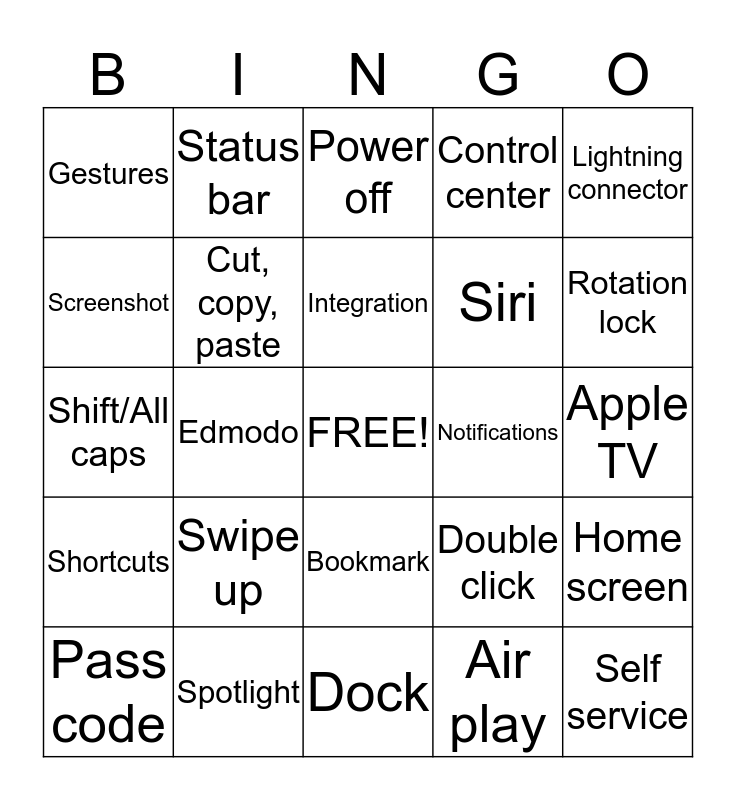 This bingo card has a free space and 24 words: Swipe up, Spotlight, Integration, Pass code, Lightning connector, Gestures, Screenshot, Status bar, Notifications, Bookmark, Siri, Shift/All caps, Double click, Home screen, Cut, copy, paste, Air play, Apple TV, Power off, Rotation lock, Edmodo, Self service, Shortcuts, Control center and Dock.