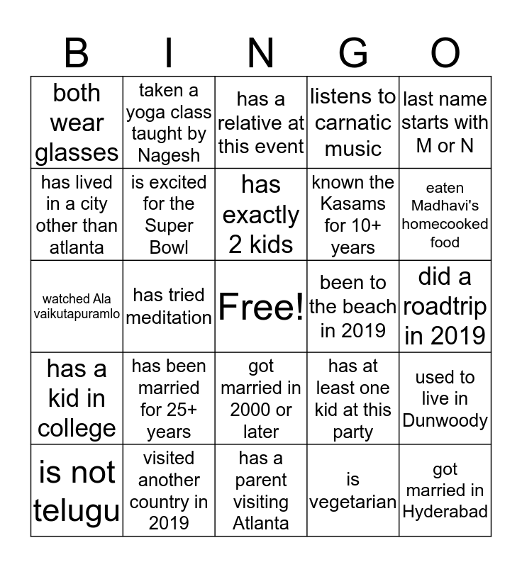 This bingo card has a free space and 24 words: has been married for 25+ years, visited another country in 2019, has exactly 2 kids, is not telugu, last name starts with M or N, both wear glasses, has lived in a city other than atlanta, taken a yoga class taught by Nagesh, been to the beach in 2019, got married in 2000 or later, known the Kasams for 10+ years, watched Ala vaikutapuramlo, has at least one kid at this party, used to live in Dunwoody, is excited for the Super Bowl, is vegetarian, did a roadtrip in 2019, has a relative at this event, eaten Madhavi's homecooked food, has tried meditation, got married in Hyderabad, has a kid in college, listens to carnatic music and has a parent visiting Atlanta.