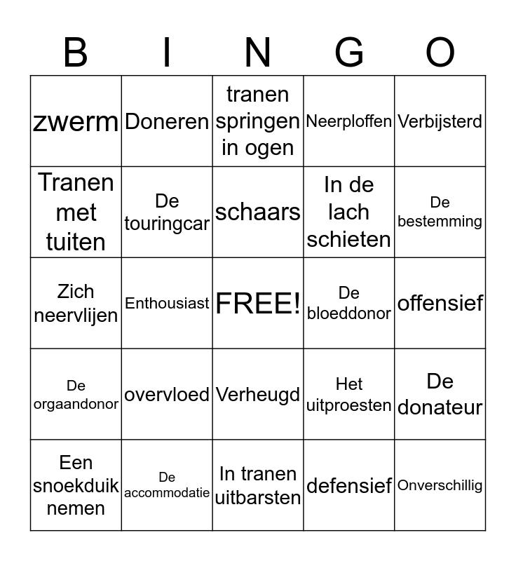 This bingo card has a free space and 27 words: Het uitproesten, Hikken van de lach, In de lach schieten, In tranen uitbarsten, Tranen met tuiten, tranen springen in ogen, Doneren, De orgaandonor, De bloeddonor, De donateur, Zich neervlijen, Neerploffen, Een snoekduik nemen, De accommodatie, De bestemming, De excursie, De touringcar, schaars, overvloed, zwerm, offensief, defensief, Enthousiast, Onverschillig, Verheugd, Verbijsterd and Verontwaardigd.