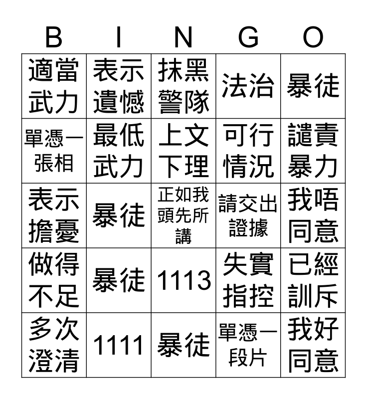 This bingo card has a free space and 24 words: 暴徒, 1111, 上文下理, 多次澄清, 暴徒, 適當武力, 單憑一張相, 表示遺憾, 請交出證據, 1113, 可行情況, 表示擔憂, 失實指控, 已經訓斥, 最低武力, 單憑一段片, 我唔同意, 抹黑警隊, 譴責暴力, 暴徒, 我好同意, 做得不足, 法治 and 暴徒.