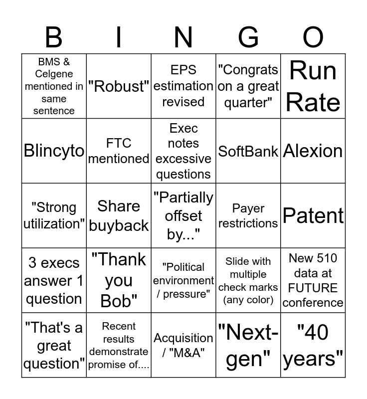 This bingo card has 37 words: Analysts are told TWICE; one question per, "Parity", Exec laughs at own joke, FTC mentioned, New 510 data at FUTURE conference, "Thank you Bob", Exec notes excessive questions, Sustainable / Sustainability, Run Rate, Not divulging details of contract, Share buyback, "Congrats on a great quarter", "Partially offset by...", Patent, Blincyto, 3 execs answer 1 question, "Robust growth in...", EPS estimation revised, "Political environment / pressure", Payer restrictions, BMS & Celgene mentioned in same sentence, Alexion, "That's a great question", Acquisition / "M&A", "Pleased with our performance", "Next-gen", "Robust", "Pricing Environment", "JPAC" **Not on a slide**, "Long term trend", "Transformation", Recent results demonstrate promise of...., "Strong utilization", "40 years", Slide with multiple check marks (any color), SoftBank and "Emerging competition".