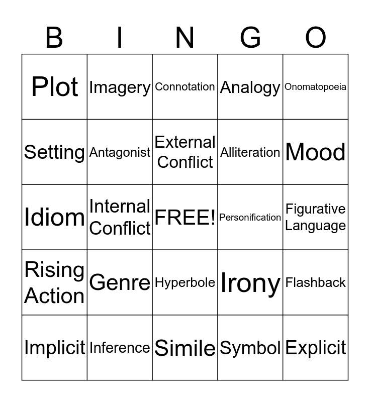 This bingo card has a free space and 43 words: Exposition, Explicit, Falling Action, Implicit, Theme, Symbol, Connotation, Foreshadowing, Onomatopoeia, Inference, Analogy, Personification, Hyperbole, Genre, Tone, Simile, Dialogue, Idiom, Denotation, Mood, Imagery, Fantasy, Climax, Plot, Lyric, Figurative Language, Assonance, 3rd Person Omniscient, Irony, Rising Action, Free Verse, Flashback, 1st Person Perspective, Internal Conflict, Chronological, Resolution, Allusion, External Conflict, Setting, Alliteration, Protagonist, Antagonist and Metaphor.