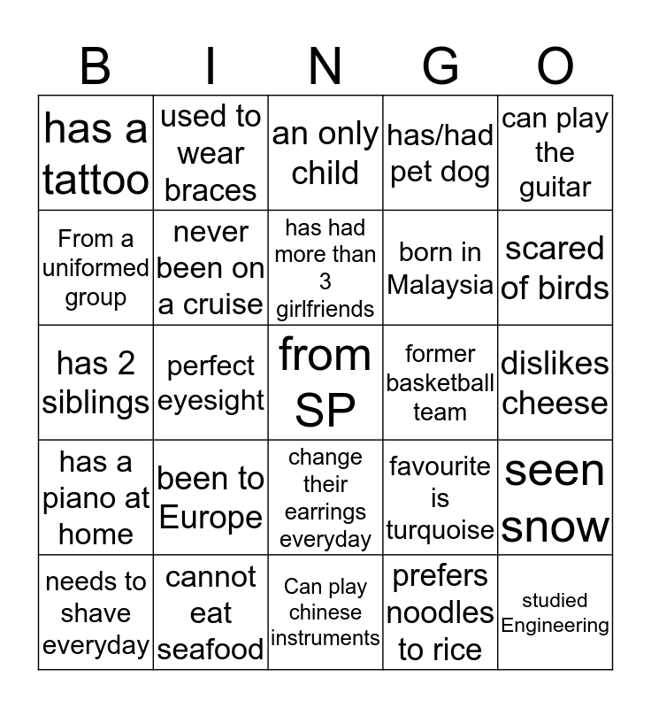 This bingo card has 25 words: been to Europe, Can play chinese instruments, has had more than 3 girlfriends, needs to shave everyday, can play the guitar, has a tattoo, From a uniformed group, used to wear braces, former basketball team, change their earrings everyday, born in Malaysia, has 2 siblings, favourite is turquoise, seen snow, never been on a cruise, studied Engineering, dislikes cheese, an only child, scared of birds, perfect eyesight, from SP, cannot eat seafood, has a piano at home, has/had pet dog and prefers noodles to rice.