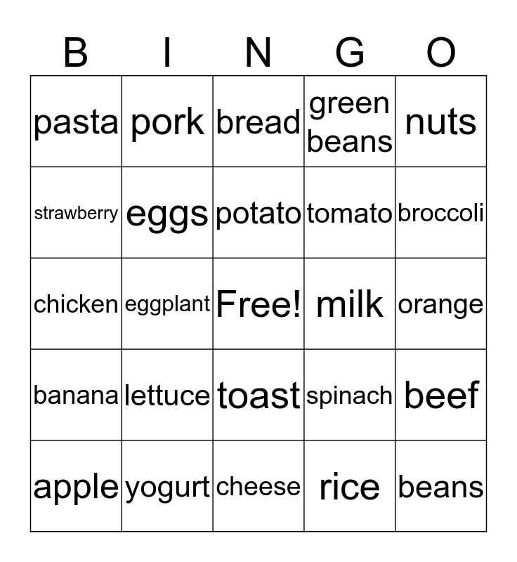 This bingo card has a free space and 29 words: apple, fish, eggplant, grapes, pasta, bread, eggs, lettuce, milk, yogurt, orange, beans, cheese, rice, broccoli, pear, toast, banana, nuts, chicken, spinach, mushroom, tomato, strawberry, green beans, pork, beef, potato and avocado.