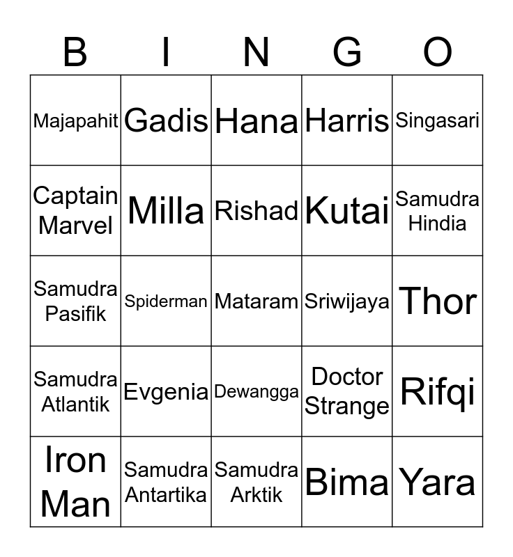 This bingo card has a free space and 24 words: Evgenia, Samudra Antartika, Rishad, Iron Man, Singasari, Majapahit, Captain Marvel, Gadis, Sriwijaya, Dewangga, Kutai, Samudra Pasifik, Doctor Strange, Rifqi, Milla, Bima, Thor, Hana, Samudra Hindia, Spiderman, Yara, Samudra Atlantik, Harris and Samudra Arktik.