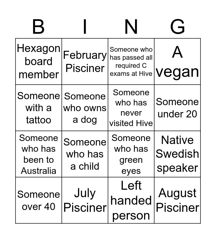 This bingo card has 16 words: July Pisciner, Native Swedish speaker, Someone who has passed all required C exams at Hive, Hexagon board member, Someone who has been to Australia, February Pisciner, Someone who has green eyes, Left handed person, Someone with a tattoo, Someone who owns a dog, Someone over 40, A vegan, Someone who has a child, Someone under 20, Someone who has never visited Hive and August Pisciner.