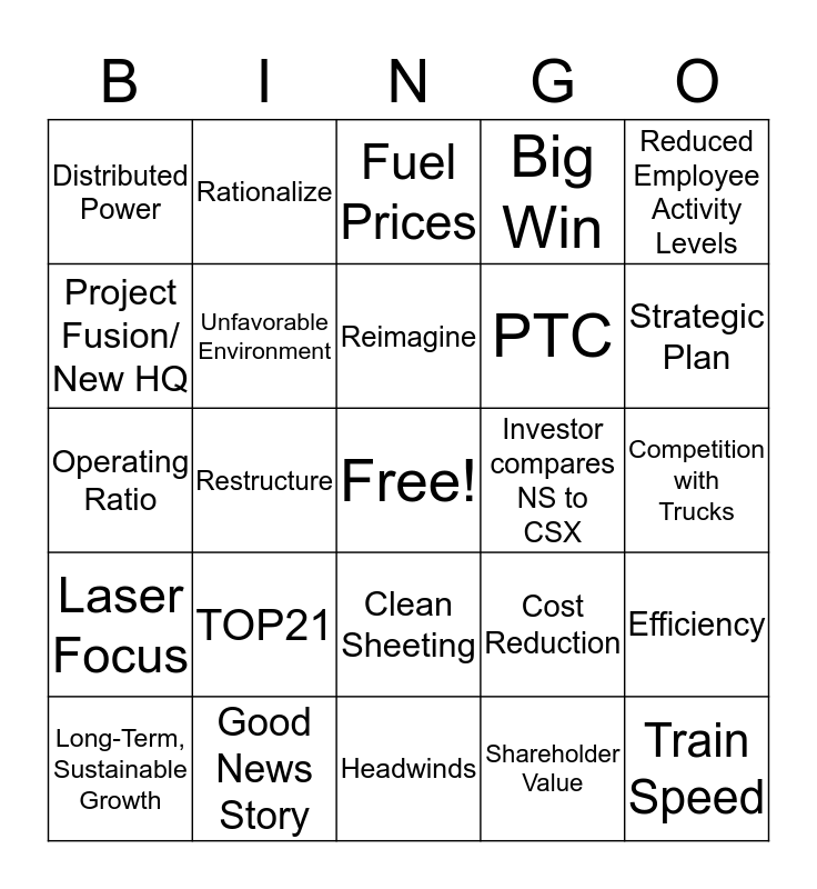 This bingo card has a free space and 24 words: TOP21, Good News Story, Reimagine, Long-Term, Sustainable Growth, Reduced Employee Activity Levels, Distributed Power, Project Fusion/ New HQ, Rationalize, Investor compares NS to CSX, Clean Sheeting, PTC, Operating Ratio, Cost Reduction, Efficiency, Unfavorable Environment, Shareholder Value, Competition with Trucks, Fuel Prices, Strategic Plan, Restructure, Train Speed, Laser Focus, Big Win and Headwinds.
