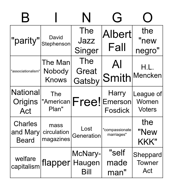 This bingo card has a free space and 29 words: welfare capitalism, "pink collar" jobs, The "American Plan", A. Philip Randolph, "parity", The Jazz Singer, The Man Nobody Knows, mass circulation magazines, Harry Emerson Fosdick, flapper, League of Women Voters, Sheppard Towner Act, McNary-Haugen Bill, "self made man", H.L. Mencken, Charles Lindbergh, Lost Generation, Charles and Mary Beard, the "new negro", National Origins Act, "compassionate marriages", fundamentalism, Al Smith, "associationalism", Albert Fall, David Stephenson, the "New KKK", The Great Gatsby and F. Scott Fitzgerald.