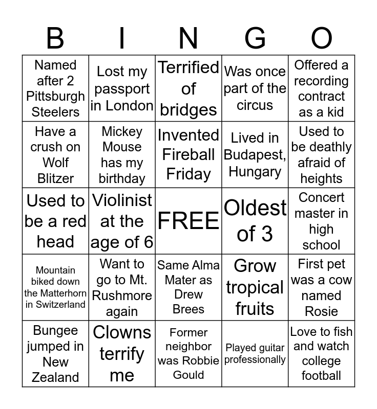 This bingo card has a free space and 40 words: Visited 15 countries, Used to be a red head, Jumped out of a plane 30 times, Mickey Mouse has my birthday, Clowns terrify me, Same Alma Mater as Drew Brees, Invented Fireball Friday, Favorite author is Ken Follett, Offered a recording contract as a kid, Mountain biked down the Matterhorn in Switzerland, Violinist at the age of 6, Was once part of the circus, Love to fish and watch college football, Concert master in high school, Oldest of 3, Want to go to Mt. Rushmore again, Spend my spare time restoring classic cars, Named after 2 Pittsburgh Steelers, Writing a movie in my spare time, Terrified of bridges, First pet was a cow named Rosie, Played guitar professionally, Lived in Budapest, Hungary, Have a crush on Wolf Blitzer, Read over 100 novels a year, 2x spelling bee champ in elementary school, More comfortable in water than on land, Major in college was rec therapy/adaptive sports, Play basketball with the same group for the past 25 years, Scrape off pizza toppings to eat separately, Canadian, Bungee jumped in New Zealand, Married high school sweetheart, Grow tropical fruits, Used to be deathly afraid of heights, Former neighbor was Robbie Gould, Believes beer is the nectar of Gods, House used to be a funeral home, Lost my passport in London and Once had 9 dogs.