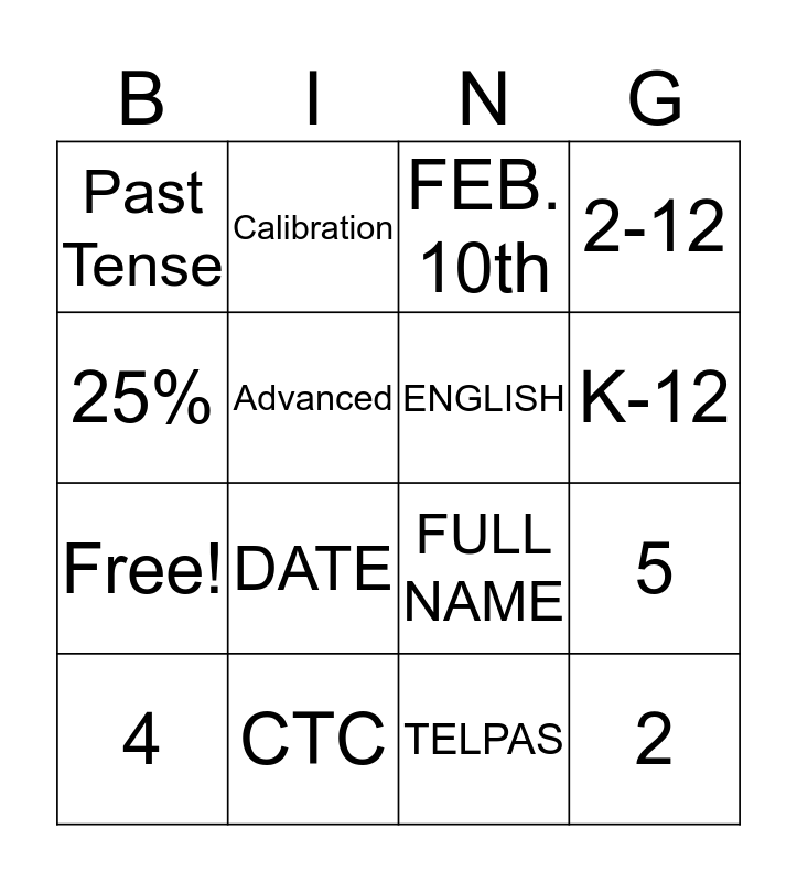 This bingo card has 20 words: 5, LISTENING, FEB. 10th, APRIL 3rd, 4, 25%, CTC, Past Tense, Free!, Calibration, DATE, FULL NAME, Advanced, 2, ENGLISH, Corrections, K-12, 2-12, TELPAS and Advanced High.