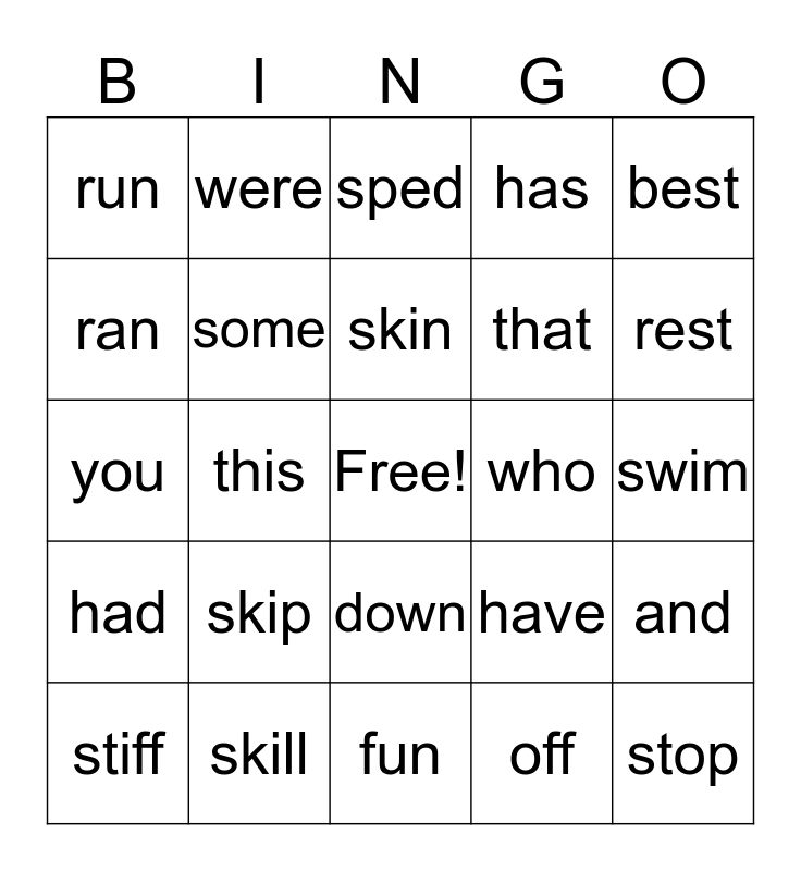 This bingo card has a free space and 24 words: skip, skill, skin, stiff, best, run, ran, were, who, down, that, you, have, and, some, off, swim, sped, rest, this, stop, had, has and fun.