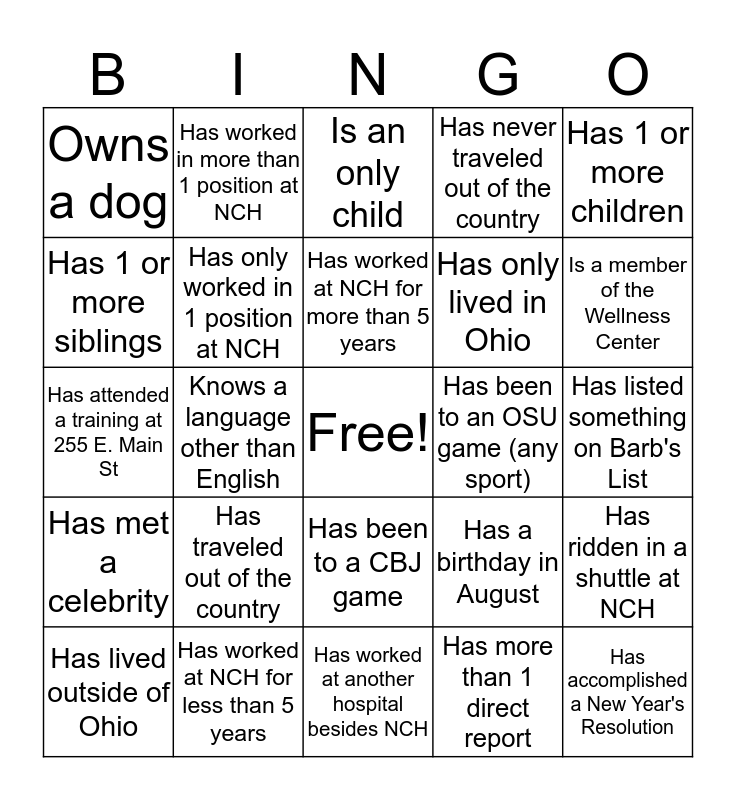 This bingo card has a free space and 24 words: Has traveled out of the country, Has worked at NCH for less than 5 years, Has worked at NCH for more than 5 years, Has lived outside of Ohio, Has 1 or more children, Owns a dog, Has 1 or more siblings, Has worked in more than 1 position at NCH, Has been to an OSU game (any sport), Has been to a CBJ game, Has only lived in Ohio, Has attended a training at 255 E. Main St, Has a birthday in August, Has ridden in a shuttle at NCH, Has only worked in 1 position at NCH, Has more than 1 direct report, Has listed something on Barb's List, Is an only child, Is a member of the Wellness Center, Knows a language other than English, Has accomplished a New Year's Resolution, Has met a celebrity, Has never traveled out of the country and Has worked at another hospital besides NCH.