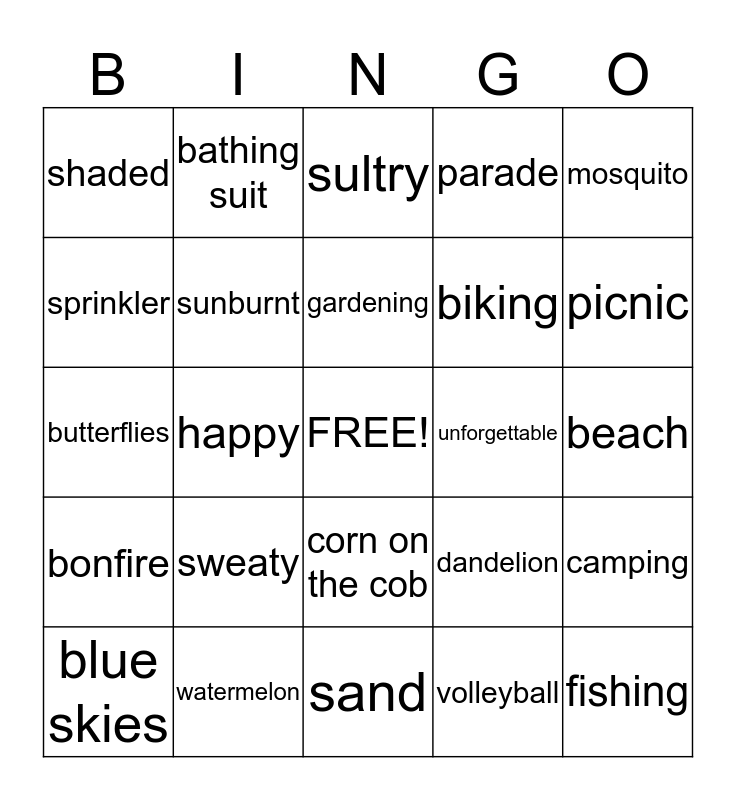 This bingo card has a free space and 29 words: blue skies, delightful, happy, sun-kissed, shaded, sultry, sunburnt, sweaty, unforgettable, watermelon, beach, fishing, sand, volleyball, picnic, lemonade, corn on the cob, bonfire, mosquito, butterflies, dandelion, BBQ, biking, sprinkler, parade, bathing suit, camping, gardening and rain.
