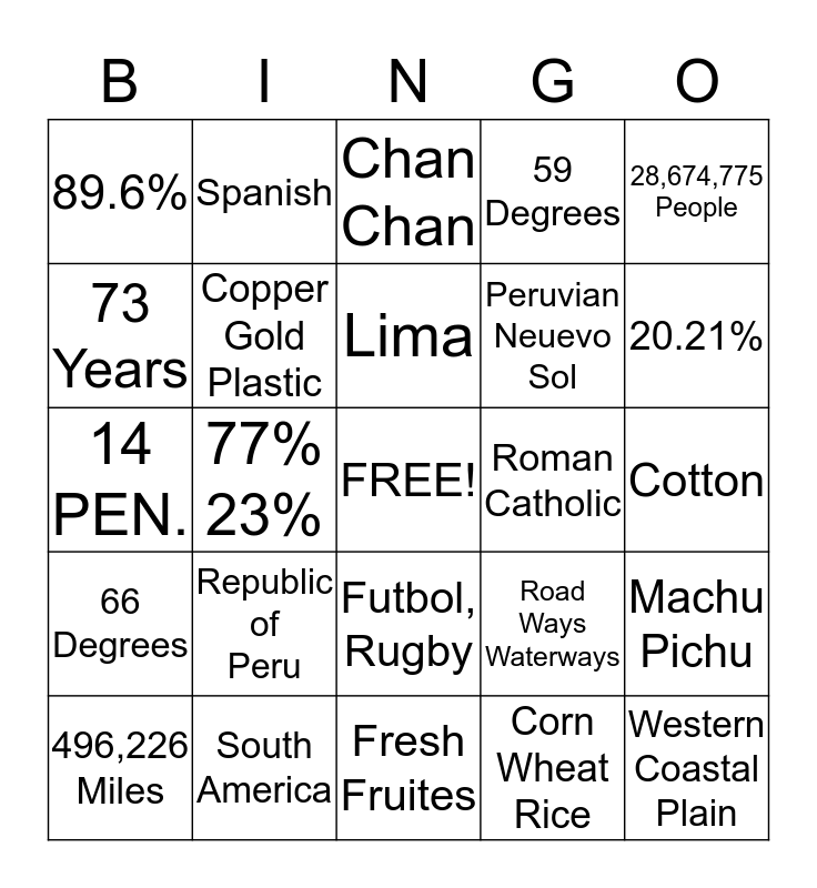 This bingo card has a free space and 24 words: Republic of Peru, South America, Lima, 496,226 Miles, 28,674,775 People, 89.6%, 73 Years, Spanish, Roman Catholic, Futbol, Rugby, Peruvian Neuevo Sol, 14 PEN., Road Ways Waterways, Machu Pichu, Copper Gold Plastic, Corn Wheat Rice, Cotton, Chan Chan, 20.21%, 77% 23%, Western Coastal Plain, 66 Degrees, 59 Degrees and Fresh Fruites.