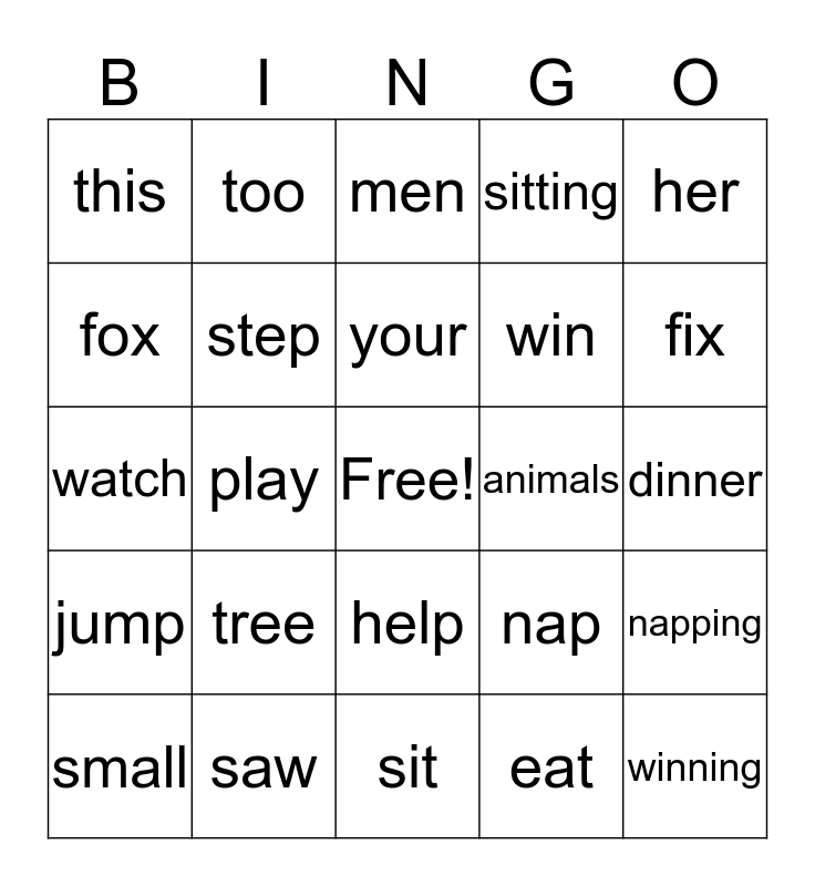 This bingo card has a free space and 24 words: small, tree, your, eat, her, this, too, men, animals, dinner, watch, step, nap, napping, fox, saw, sit, sitting, fix, jump, play, help, win and winning.