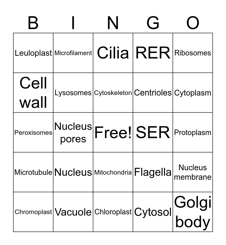 This bingo card has a free space and 24 words: Nucleus, Vacuole, Cytoskeleton, Chromoplast, Ribosomes, Leuloplast, Cell wall, Microfilament, SER, Mitochondria, Centrioles, Peroxisomes, Flagella, Nucleus membrane, Lysosomes, Cytosol, Protoplasm, Cilia, Cytoplasm, Nucleus pores, Golgi body, Microtubule, RER and Chloroplast.