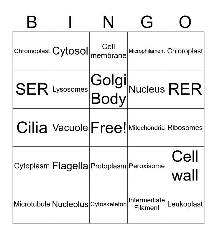 This bingo card has a free space and 24 words: Flagella, Nucleolus, Golgi Body, Microtubule, Chloroplast, Chromoplast, SER, Cytosol, Mitochondria, Protoplasm, Nucleus, Cilia, Peroxisome, Cell wall, Lysosomes, Intermediate Filament, Ribosomes, Cell membrane, RER, Vacuole, Leukoplast, Cytoplasm, Microphilament and Cytoskeleton.