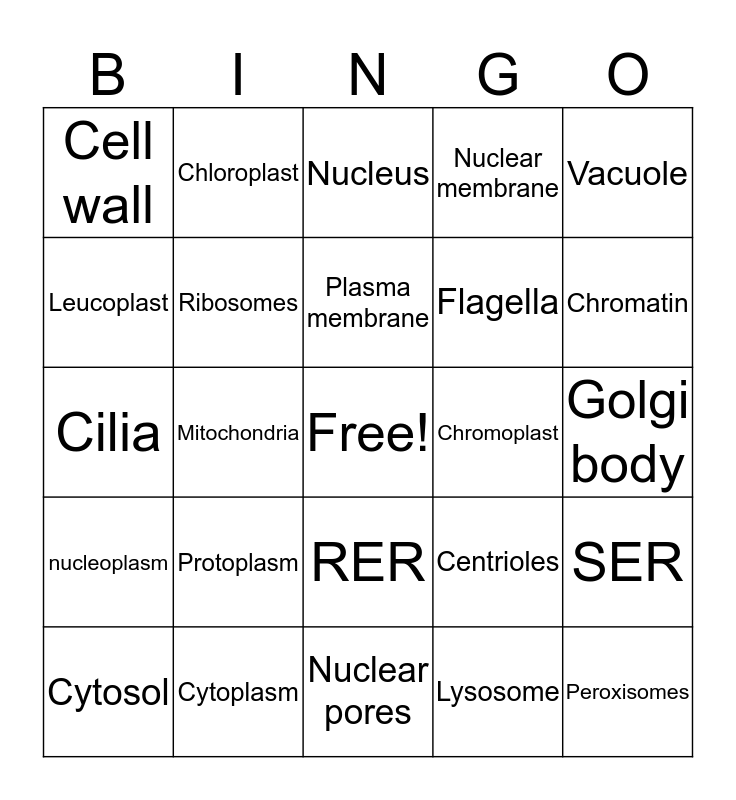 This bingo card has a free space and 24 words: Protoplasm, Cytoplasm, Plasma membrane, Cytosol, Vacuole, Cell wall, Leucoplast, Chloroplast, Chromoplast, RER, Flagella, Cilia, Centrioles, SER, Ribosomes, Lysosome, Golgi body, Nucleus, Chromatin, Mitochondria, Peroxisomes, nucleoplasm, Nuclear membrane and Nuclear pores.