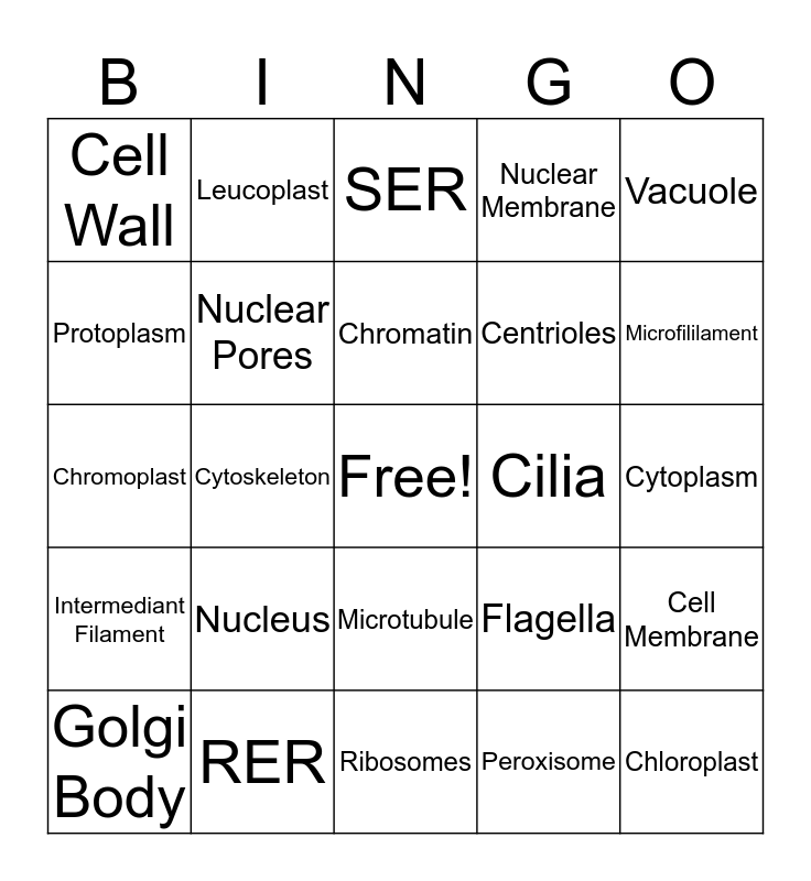 This bingo card has a free space and 24 words: Nucleus, RER, Chromatin, Golgi Body, Vacuole, Cell Wall, Protoplasm, Leucoplast, Cilia, Microtubule, Centrioles, Chromoplast, Flagella, Cell Membrane, Nuclear Pores, Peroxisome, Cytoplasm, SER, Microfililament, Cytoskeleton, Chloroplast, Intermediant Filament, Nuclear Membrane and Ribosomes.