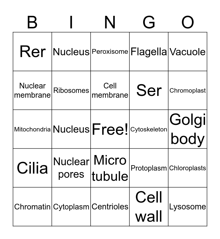 This bingo card has a free space and 24 words: Nuclear pores, Cytoplasm, Cell membrane, Chromatin, Vacuole, Rer, Nuclear membrane, Nucleus, Cytoskeleton, Micro tubule, Ser, Mitochondria, Protoplasm, Chloroplasts, Ribosomes, Cell wall, Golgi body, Peroxisome, Chromoplast, Nucleus, Lysosome, Cilia, Flagella and Centrioles.