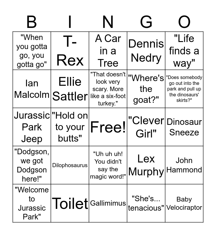 This bingo card has a free space and 49 words: Brachiosaurus (Long Neck), Baby Velociraptor, Velociraptor, Gallimimus, Dilophosaurus, Triceritops, T-Rex, Dinosaur Eggs, Ian Malcolm, Alan Grant, Ellie Sattler, Dennis Nedry, John Hammond, Lex Murphy, Tim Murphy, "Dinosaurs eat man. Woman inherits the earth", "That doesn't look very scary. More like a six-foot turkey.", "Clever Girl", "Stick! Stick stupid! Ah, no wonder you're extinct.", "Life finds a way", "Hold on to your butts", "She's... tenacious", "When you gotta go, you gotta go", "Where's the goat?", "What do they got in there? King Kong?", "Does somebody go out into the park and pull up the dinosaurs' skirts?", "Welcome to Jurassic Park", "Spared no expense.", "Uh uh uh! You didn't say the magic word!", "Dodgson, we got Dodgson here!", Hammond's Staff, Mr. Arnold's Arm, Night-vision Goggles, Raptor Claw, Toilet, Dinosaur Droppings, Mr.DNA, THE Cup of Water, Dinosaur Sneeze, Flare, Amberized Mosquito, Barbasol Can, Jurassic Park Raincoat, Jurassic Park Enterance, Jurassic Park Jeep, A Car in a Tree, Freezer, "When Dinosaurs Ruled The Earth" Banner and Cow.