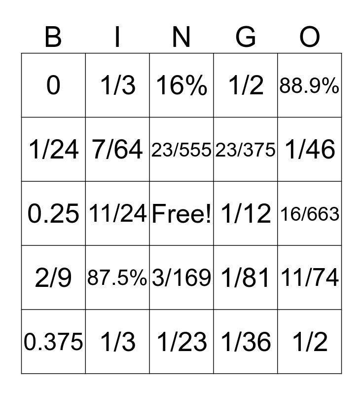 This bingo card has a free space and 30 words: 1/3, 35%, 11/24, 0.68, 0, 16%, 7/64, 3/169, 1/12, 1/23, 16/663, 1/2, 1/36, 2/13, 1/46, 0.2, 1/81, 2/9, 87.5%, 88.9%, 0.25, 1/25, 1/3, 23/375, 1/24, 1/2, 11/74, 0.375, 23/555 and 1/16.